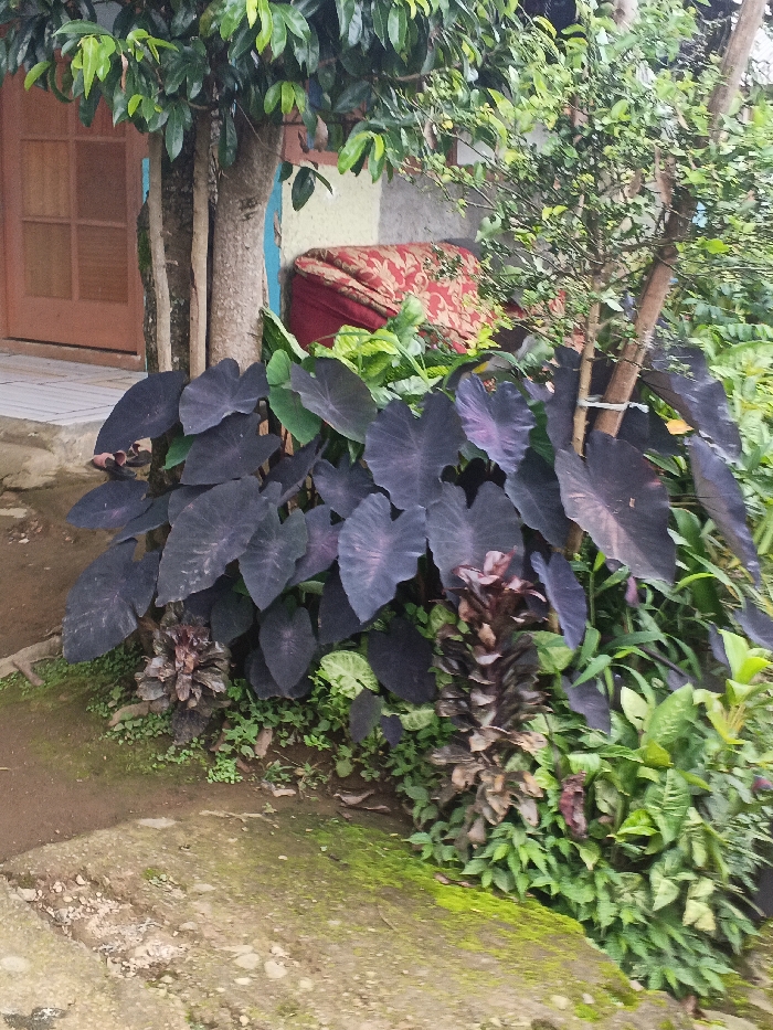 The scene is located in Pinnwe, Myanmar (Burma). The image depicts an outdoor environment featuring dense vegetation adjacent to a building. In the foreground, a brown dirt path is on the left, meeting a moss-covered concrete or stone border on the right. The mid-ground is dominated by numerous large, dark purplish-green, heart-shaped leaves, consistent with Colocasia plants. Smaller green and reddish-brown foliage grows around them. To the left background, a light brown wooden door with paneling is visible, part of a structure. A tree trunk with green leaves extends upwards behind the large plants. Further right in the background, a segment of a building wall, painted light yellow with a vertical blue stripe, is partially obscured by foliage. A red mattress or large cushion with a patterned gold floral design rests against this wall. No individuals are present. The environment suggests a domestic or semi-cultivated garden area.