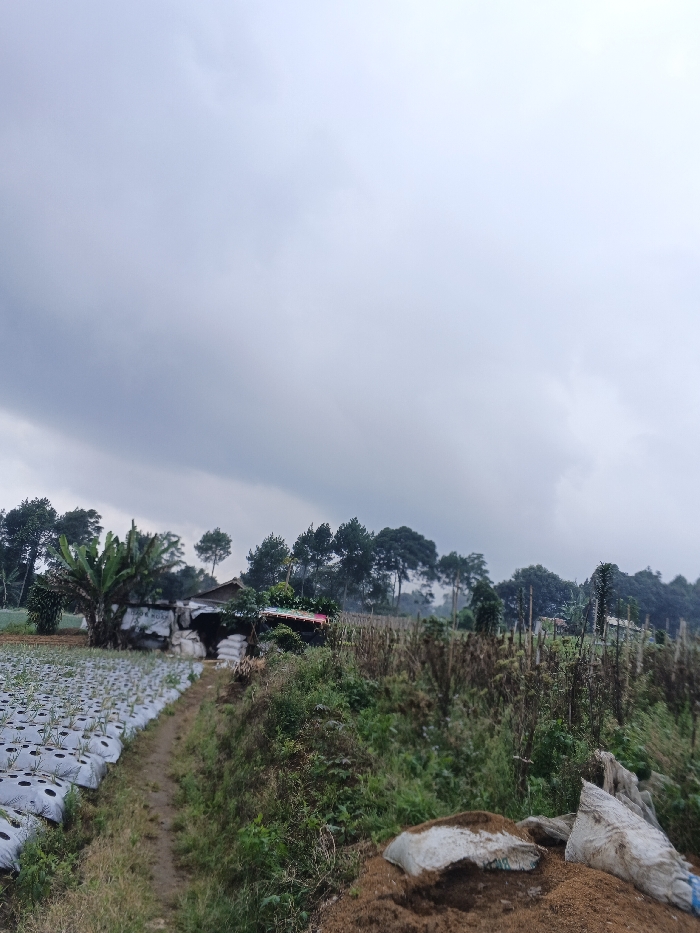 A cloudy sky hangs over a rural landscape. In the foreground, a dirt path separates a field covered in white plastic mulch from overgrown vegetation. A small shack or shed stands next to the field, with bags stacked around it. Beyond, various trees dot the horizon, and hills rise in the distance. More bags and dirt are piled in the extreme foreground. The overcast conditions lend a muted tone to the scene.