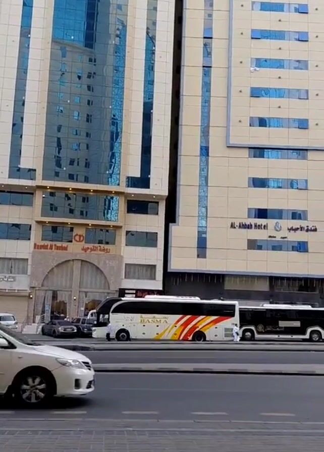 The video depicts a street scene in front of two modern buildings in Saudi Arabia. The building on the left has a mirrored glass facade on its taller portion and a light beige stone facade on the lower portion, with "Rawdat Al Tawheed" written in Arabic and English. To the right is another, slightly shorter building with a beige stone facade, identified as "Al-Ahbab Hotel" in Arabic and English. The street, paved with gray bricks, has vehicular traffic. A white Toyota Corolla passes in front of two parked "BASMA" buses, colored white with a red and yellow horizontal graphic stripe. A person wearing traditional Saudi attire, a white thobe, is standing near one of the buses. A bird flies across the frame.