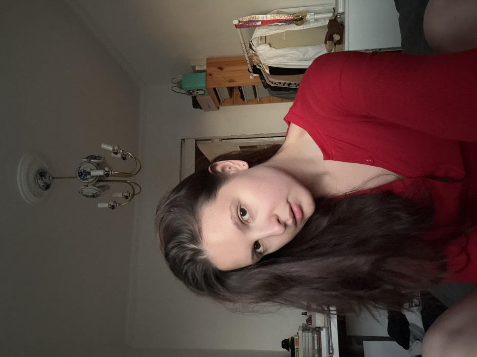 The image captures a female subject positioned centrally in an indoor residential setting in Moscow, Russia. The subject, a woman with long, dark brown hair and a fair complexion, faces the viewer directly with a neutral expression. She is depicted from the chest up, wearing a red, long-sleeved, collared shirt with visible buttons, and has two small piercings on her left ear. The background reveals a room with light-colored walls and a white ceiling bordered by molding. A five-arm chandelier, featuring brass-colored accents and white porcelain components decorated with blue floral patterns, hangs from the ceiling. To the subject's left, a stack of books and a dark object rest on a light-toned surface. To her right, a multi-shelf wooden unit is visible, topped with a light blue bag and a small white container. Adjacent to this unit, a clothing rack holds various garments. Hanging prominently from the clothing rack is a red and white ribbon adorned with two gold-colored medals, where the word "MOSCOW" is clearly discernible, indicating the city location. Below the clothing rack, a brown stuffed animal is visible on a white surface. A doorway leading to another area is partially visible in the distant background. Natural light enters the scene from the left, illuminating the subject and portions of the room.
