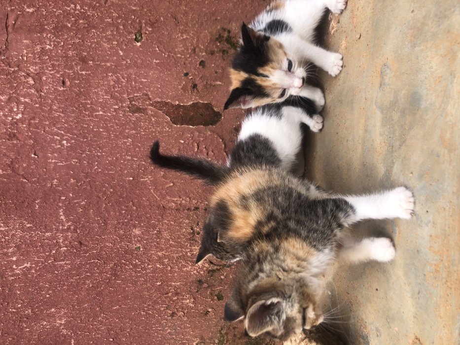 Location: Akpaka Forest Reser, Nigeria. Three kittens are situated on a light brown ground surface, positioned against a textured, reddish-brown wall exhibiting peeling paint and localized discoloration. The kitten on the left is a calico with tabby-like markings in brown, black, and white, featuring white paws, and its head is oriented towards the left. The central kitten, partially obscured, also displays a calico pattern with black, white, and tan fur, and its black tail is held vertically erect. The kitten on the right, predominantly white with black and tan patches on its head and back, has its head lowered and directed towards the ground. All kittens are standing. No human subjects are present in the scene.