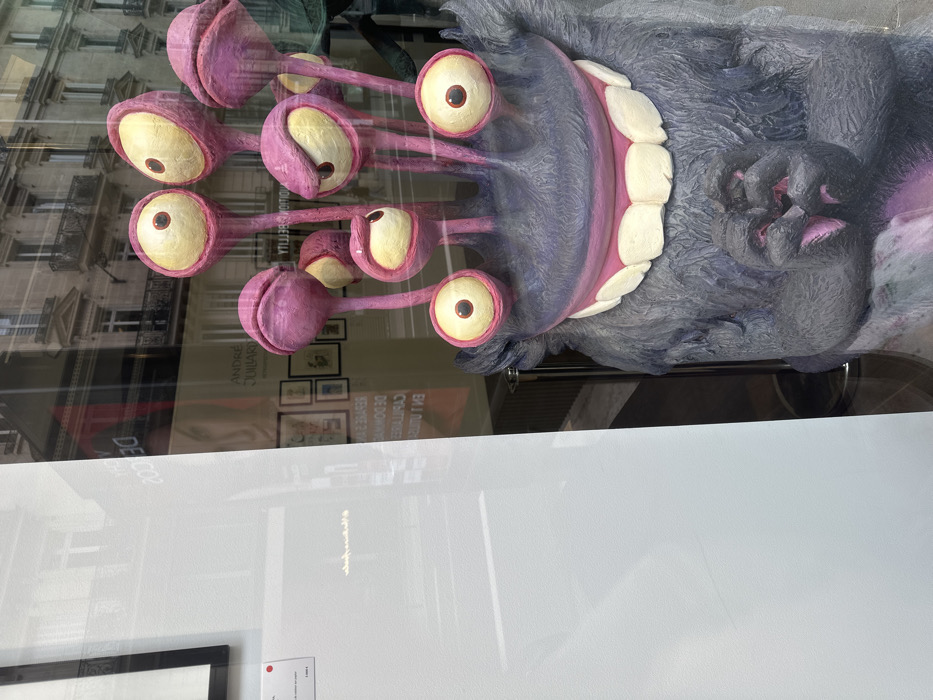 - "A large, purple-gray, shaggy monster sculpture is displayed behind a reflective glass window, likely a storefront or gallery, in Paris, France" by FM-n6yWE2, licensed under CC BY 4.0