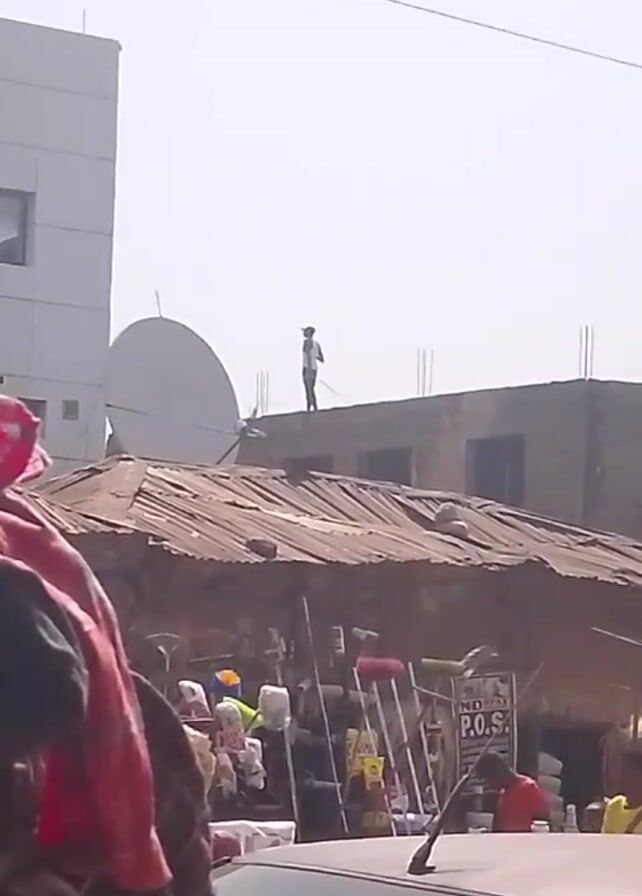 man standing on the roof of a building in a busy urban environment. The man is wearing a white shirt and dark pants, and he appears to be looking around. Below him is another building with a corrugated metal roof, and there are people and objects on the ground in front of it. In the background, there is a taller, white building with a satellite dish on top. The overall scene suggests a bustling commercial area with a mix of older and newer buildings. The video is shot from a slightly low angle, possibly from a moving vehicle.