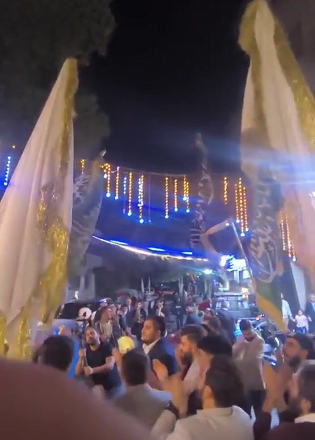 At night, a crowd of people gathers on a street illuminated with strings of lights. Many individuals are dressed in suits. Some are clapping their hands and seem to be enjoying themselves. There are several large white flags with gold trim, and green flags with Arabic script, being waved in the air. The flags and lights decorate what appears to be a celebration or procession.