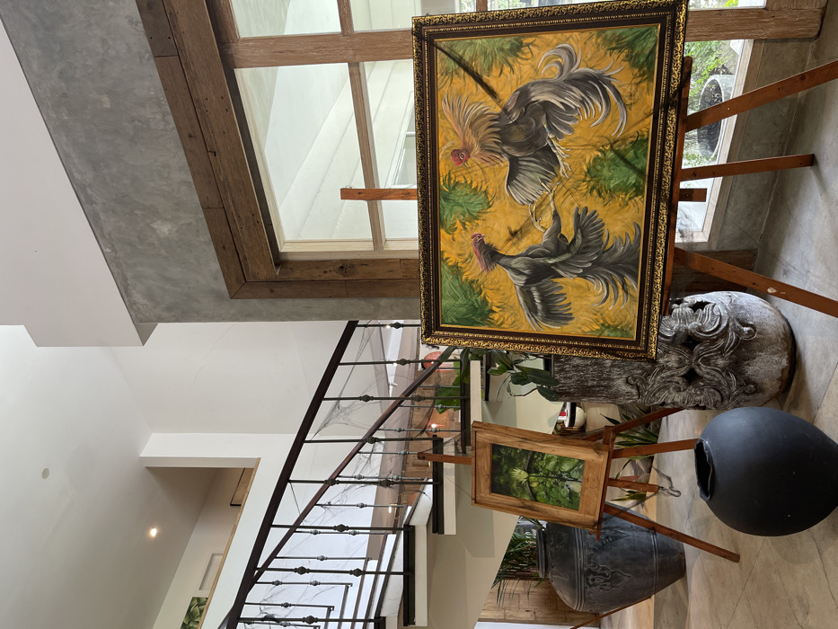 The image depicts an interior space, likely a gallery or exhibition area, located in Bogor, Indonesia. In the foreground, two paintings are displayed on wooden easels. The prominent painting on the right features an artwork portraying two roosters in an aggressive posture against a vibrant yellow background with green foliage, enclosed within an ornate gold frame. To its left, a smaller painting on a separate easel showcases a white blossom on a green plant, set in a plain wooden frame. The background reveals a multi-story structure with a grand staircase on the left, featuring dark metal balusters and white steps with a marble pattern, ascending to an upper level. Various decorative objects are arranged on the light-toned floor, including a large, dark grey, ornate ceramic urn on the left, a smaller black spherical vase in the center-bottom, and a distressed grey carved wooden pedestal behind the smaller painting. Green potted plants are visible at the base of the staircase and behind the easels. Architectural elements include a combination of smooth white walls and a section of exposed grey concrete wall on the right, a high white ceiling with recessed lighting, and a large, multi-paned window with a rustic wooden frame on the right, offering a view of an indistinct exterior. No individuals are present in the scene.