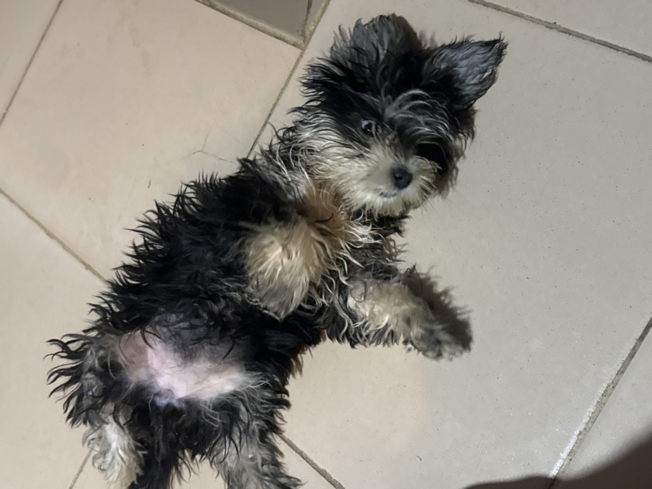 - "A small, wet dog with black and tan fur lies on its back on a tiled floor" by FM-m3tpP2, licensed under CC BY 4.0