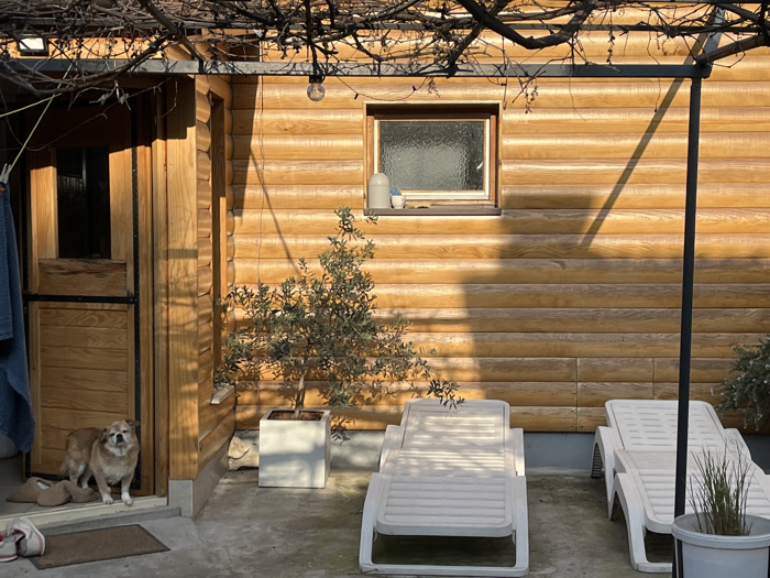 The scene depicts an outdoor patio area adjacent to a light-brown log cabin-style structure located in the City of Zagreb, Croatia. A single small, light-furred dog stands at the threshold of a partially open wooden door on the left, looking forward. Two light-brown slippers rest on a dark doormat directly in front of the door. A blue towel is draped near the door frame. The log wall features a small rectangular window with textured glass, beneath which a white cup and another small object are visible on the sill. An overhead trellis structure with bare branches is supported by a black metal post on the right and extends across the top of the frame. A single clear light bulb hangs from this trellis. Sunlight illuminates the scene, casting prominent diagonal shadows from the trellis and the metal post onto the wooden wall and concrete ground. A small potted tree with green leaves is centered in a square white planter on the concrete. Two white plastic lounge chairs are positioned on the concrete patio, with the nearest chair partially shaded. A small potted plant in a white round container is visible on the far right. No human figures are present.