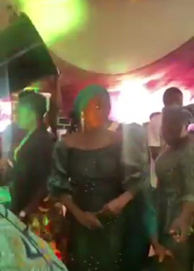 group of people dancing at an event, seemingly a wedding reception. There are multiple people in the frame, dressed in both traditional African attire and a white wedding dress. The room is decorated with colorful fabrics and lighting, suggesting a festive atmosphere. A large lighting fixture is visible in the upper left corner. The camera moves around, capturing different angles of the dancing and the overall celebration.