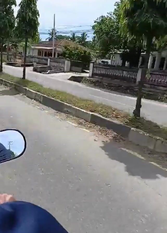 point-of-view shot from a moving motorcycle on a paved road. The rider, wearing a blue long-sleeved shirt, can be seen in the rearview mirror. The road is lined with trees and houses on both sides. Other vehicles, including a van and motorcycles, are seen driving on the opposite side of the road. The weather appears sunny and bright. The road has concrete edging with vegetation growing along it.