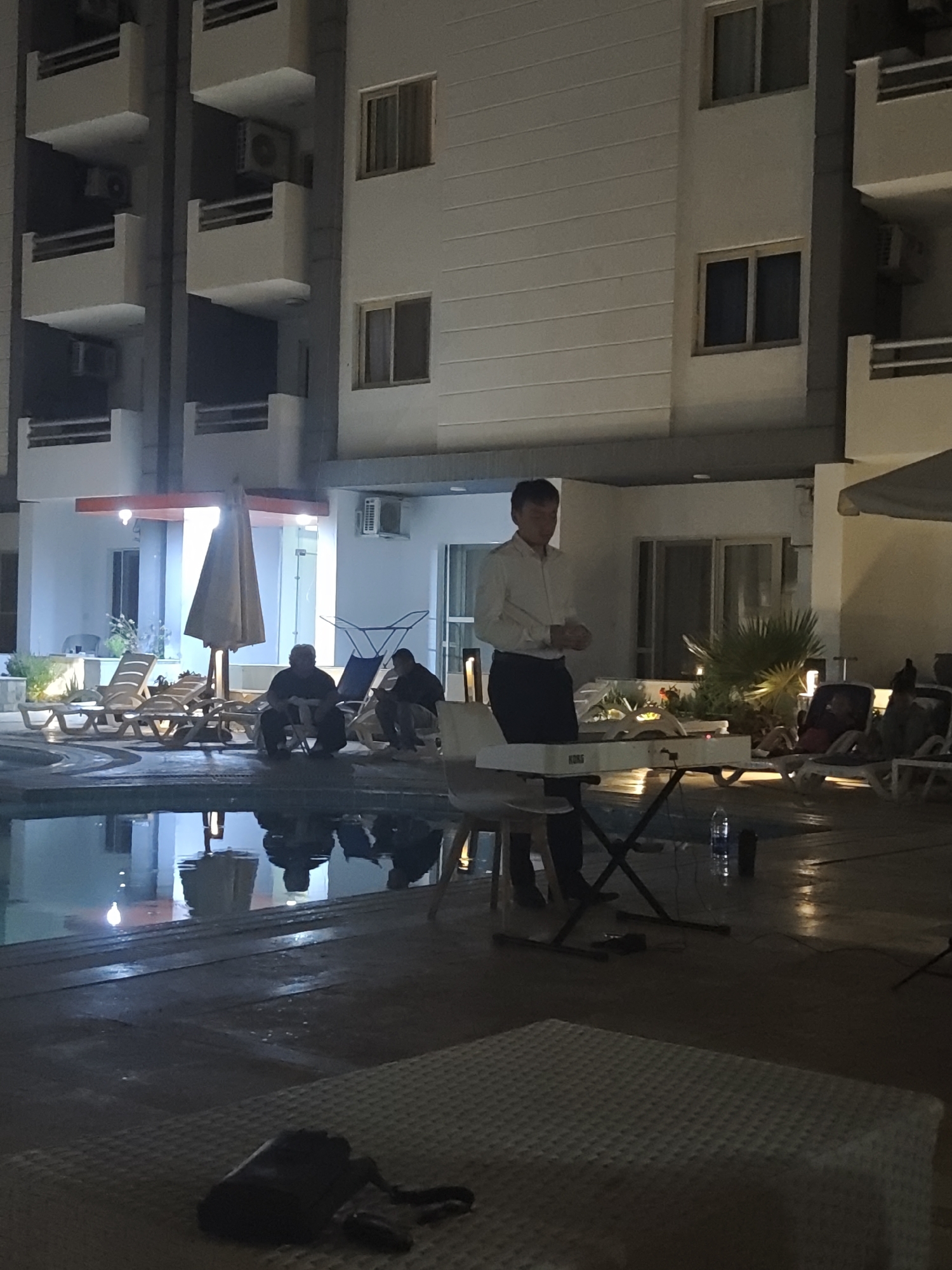 At night in Hurghada, Egypt, a man in a white shirt and black pants stands by a white keyboard set up near a pool. Two men are seated beside the pool near lounge chairs. The pool reflects the buildings behind them. A black object sits on a white patterned surface in the foreground.