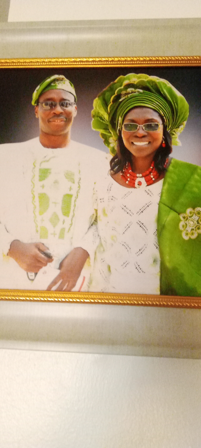 This image depicts a framed portrait mounted on a light-colored, textured wall. The frame is gold-colored and ornate. The portrait itself features two individuals, a man and a woman, positioned side-by-side against a dark, blurred background. Both subjects have dark complexions and are smiling, facing forward, wearing thin-framed eyeglasses. The man, on the left, wears a white traditional Nigerian tunic with light green embroidered patterns and a matching green cap. His right hand is visible, holding a small, dark object. The woman, on the right, wears an elaborate green headwrap (gele) with gold-colored accents, a white blouse with intricate patterned cutouts and light green details, and a green sash draped over her left shoulder. She is adorned with a multi-strand red beaded necklace featuring a central pendant and matching red bead earrings. Above the portrait frame, a section of light-colored wall molding is visible. The wall below the frame is also visible. The exact location within the city of Abuja, Nigeria, where this framed portrait is displayed cannot be determined from the visual information provided; however, the environment appears to be an interior setting, likely a residence or office.