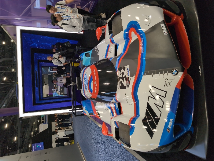 A white, gray, red, and blue BMW race car, marked with "25" and the "M" logo, is displayed on a blue carpet. The car is positioned near a group of people standing in front of a brightly lit rectangular structure filled with blue lights. Another group of people stands further in the background. The scene captures the car as a showcase piece at an event or exhibition.