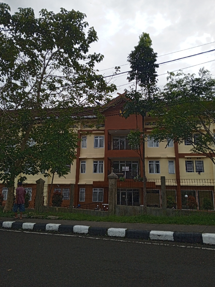 A three-story building with a brown and beige facade is partially obscured by trees. The building has balconies, white-framed windows, and a fenced perimeter. A black and white curb separates the building from the asphalt road in the foreground. A person is walking along the sidewalk. The sky is overcast and cloudy.