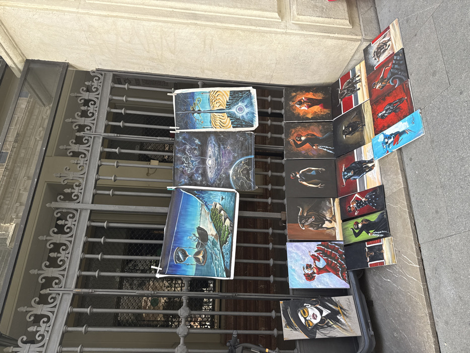 - "The image displays an outdoor art vendor's stall set against a building facade on a paved street in Seville, Spain" by FM-PDjLC3, licensed under CC BY 4.0