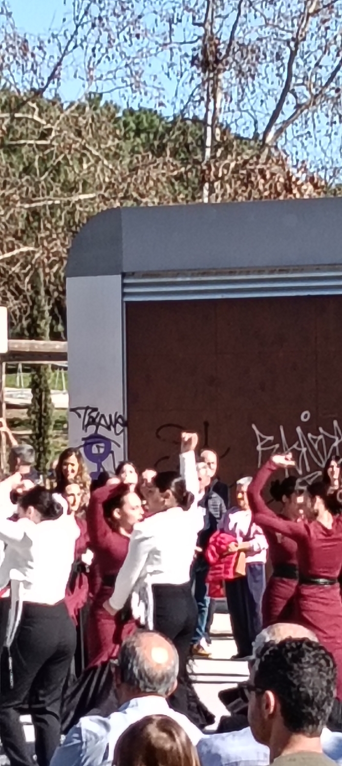 This image depicts an outdoor event in Ripollet, Spain, under a clear blue sky. The scene is dominated by a group of approximately seven individuals, primarily women, engaged in a synchronized performance. Two women in the central foreground wear white long-sleeved shirts and black pants; one on the left has her left arm raised with a clenched fist, looking right. At least three women in dark red/maroon long-sleeved dresses are positioned nearby, with their arms raised in stylized dance postures. Most performers have their hair pulled back. In the background, a dark brown wall, possibly part of a building or stage backdrop, displays white and purple graffiti, including the visible word "TRANK" and other illegible markings. Above this wall, bare deciduous tree branches are silhouetted against the blue sky, with some green foliage visible behind them. The wall is topped with a dark gray fascia and features a lighter gray corner section on the left. In the bottom foreground, a male spectator with a visible bald spot and short gray hair, wearing a light blue collared shirt, is seen from behind, facing the performers. Another person's head with brown hair is partially visible in front of him. Other blurred figures, likely additional spectators or event participants, are visible throughout the background. The ground surface appears to be a light-colored pavement or similar material.