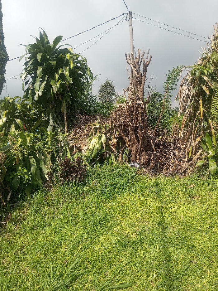 The image depicts an outdoor, unkempt vegetated area in Đăk Pxi, Vietnam, under an overcast sky. The foreground consists of unevenly cut green grass, well-lit by sunlight. In the midground, a diverse array of tropical and unmanaged plant life is visible. On the left, a tall plant with broad, green, strap-like leaves stands prominently. Centrally, a large, bare tree stump with multiple severed branches is visible, surrounded at its base by a considerable accumulation of dry organic debris, including cut branches and plant matter. A small, white piece of refuse rests on the ground amidst this debris. To the right of the stump, another large plant with elongated, partially dried leaves is present. A utility pole supporting multiple overhead power lines is positioned in the upper midground. No individuals are depicted in the scene.