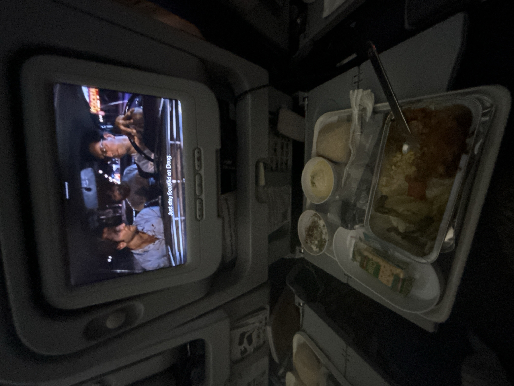 The image depicts an airplane passenger's seat with a meal tray and a screen displaying a movie