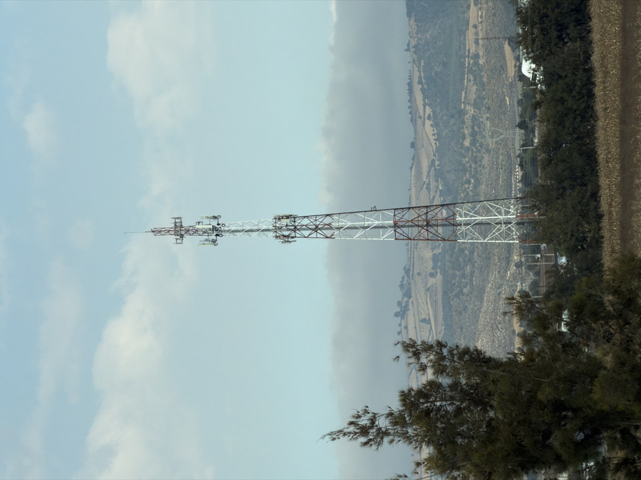 A tall communication tower stretches across the image, colored red and white, reaching into a light blue sky with scattered clouds. The background features a hazy, hilly landscape with sparse vegetation. The tower is flanked by trees and shrubbery on one side. The image appears to be rotated, altering the natural orientation of the scene.