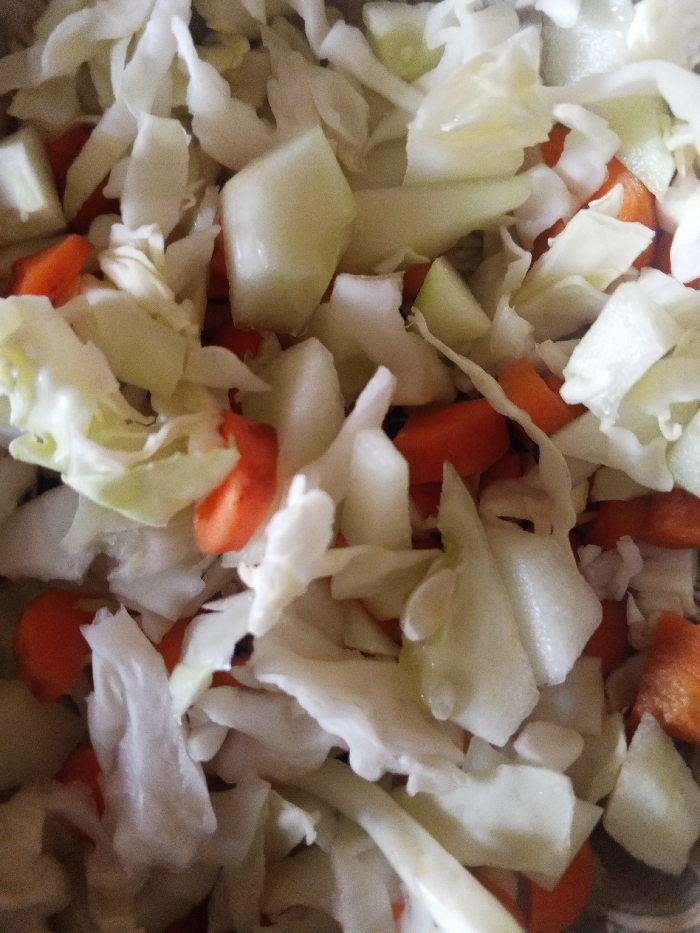 The image displays a close-up view of a mixture of chopped vegetables. White cabbage leaves dominate the scene, interspersed with bright orange carrot slices. There are also square-cut, translucent onion pieces. The ingredients appear freshly prepared and are likely components of a salad or stir-fry dish. The lighting is natural, casting a soft glow on the produce.