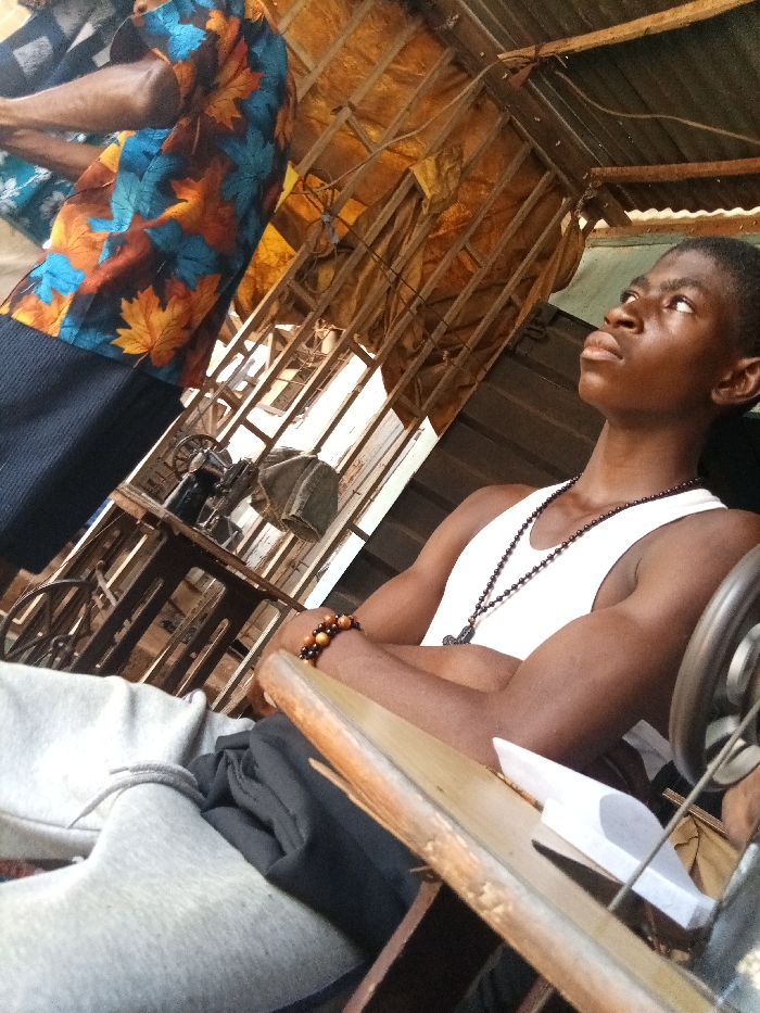 An upward-angled shot captures a young man seated, arms crossed, gazing upward. He wears a white tank top and beaded necklaces and bracelets. The background includes a sewing machine on a metal frame, with an adult wearing a leaf-patterned shirt. A makeshift roof of corrugated metal and wooden beams is overhead, adding to the rustic setting. The overall composition feels intimate and personal.