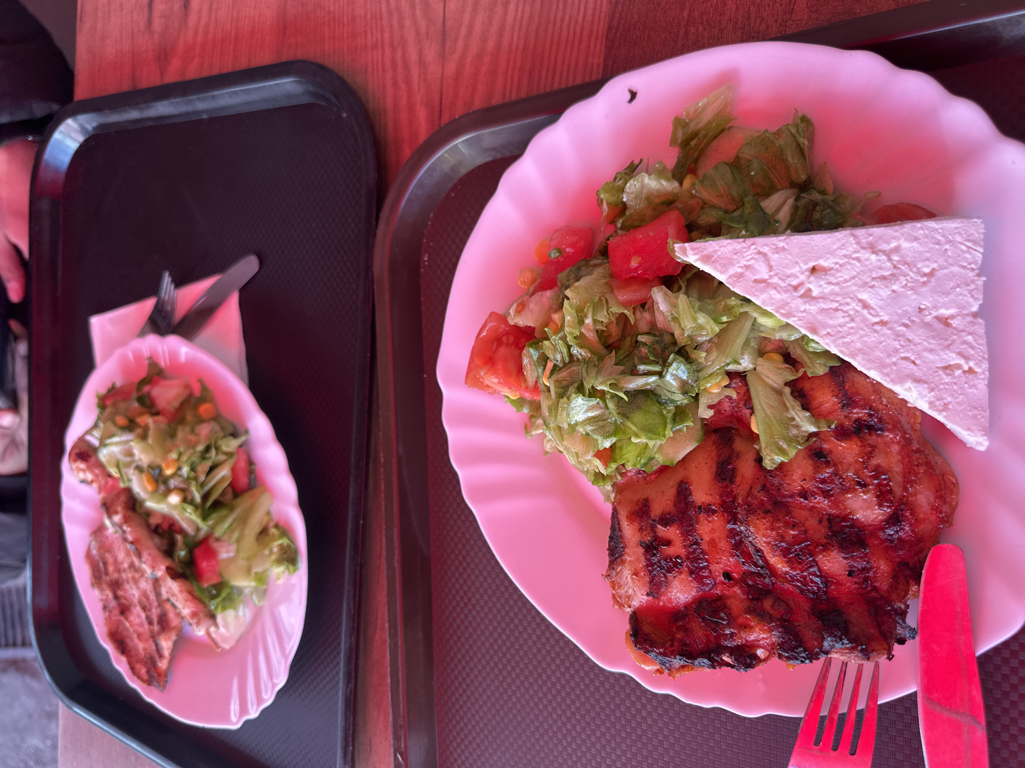 The scene is set indoors, likely within a casual eatery, cafeteria, or food court, in the city of Unknown, Unknown. Two cafeteria-style meals are presented on black, textured trays atop a reddish-hued wooden table. In the foreground, a white, fluted-edge plate holds a piece of grilled meat exhibiting distinct char marks, a side salad composed of chopped lettuce, diced tomatoes, and corn kernels, and a triangular slice of white, crumbly cheese. A bright pink plastic fork and knife are positioned to the left of this plate. In the background, a second, identical white plate displays a similar portion of grilled meat and salad. A silver metal fork rests next to the background plate. Partially visible behind the background tray are two human hands; one hand, on the left, is holding a dark-colored smartphone, while the other hand rests on the table's edge. The entire scene is bathed in a prominent red ambient light.