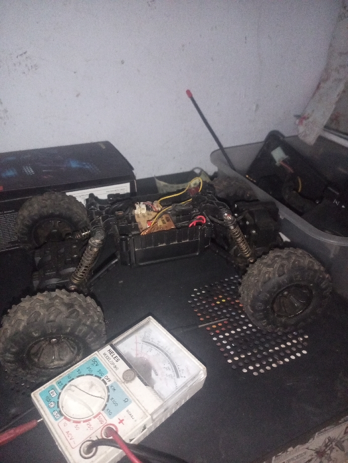 This scene, located in Ciherang, Indonesia, depicts a close-up view of a workbench or assembly area. A partially disassembled black remote-control (RC) rock crawler is positioned centrally, resting on a dark surface. The vehicle's chassis is exposed, revealing internal components including visible yellow and red wiring, and a circuit board. Four large, knobby black tires are present, with two prominent in the foreground. An antenna with a red tip extends vertically from the RC vehicle's rear section. To the lower left, a white analog multimeter, identified as "HELES MODEL SP-80," is positioned with red and black test leads connected, indicating electrical diagnostic activity. Its needle rests on a measurement scale. In the background, a dark rectangular box is situated on the left, and a dark plastic bin containing indistinct items is visible on the far right. The dark surface beneath the objects includes a perforated dark mat under the right side of the RC vehicle. The background consists of a light-colored, scuffed wall. No individuals are present in the image.