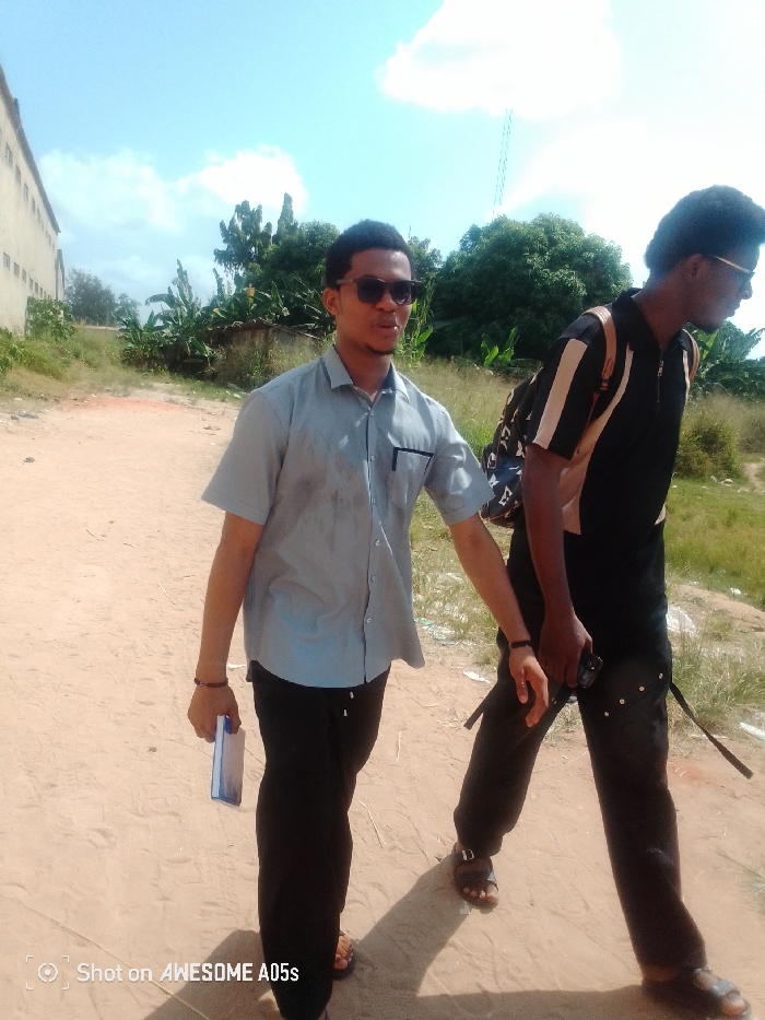 Two adult males are walking along an uneven, reddish-brown dirt path under a partially cloudy blue sky in the city of Egbagu, Nigeria. The individual on the left, foreground, exhibits a light-brown skin tone, short dark hair, and wears dark-tinted sunglasses, a light blue short-sleeved collared shirt with a dark pen in the left chest pocket, dark trousers, and light-colored sandals. This individual holds a small, blue-covered book in the left hand and has a dark beaded bracelet on the right wrist. The individual on the right, mid-ground, exhibits a darker skin tone, dark curly hair, and wears dark-tinted sunglasses, a black short-sleeved polo shirt with beige vertical stripes, dark trousers, and dark sandals. This individual carries a black and beige backpack on the back and holds a dark mobile phone in the right hand. Both individuals appear to be in motion, walking towards the right of the frame. The background features dense green foliage, including tall grass, shrubs, and trees (some resembling banana plants). In the far left background, a multi-story, light-colored building with visible windows is present. A metallic lattice tower is visible in the distant background against the sky. Shadows are cast by the subjects, indicating bright daylight conditions.