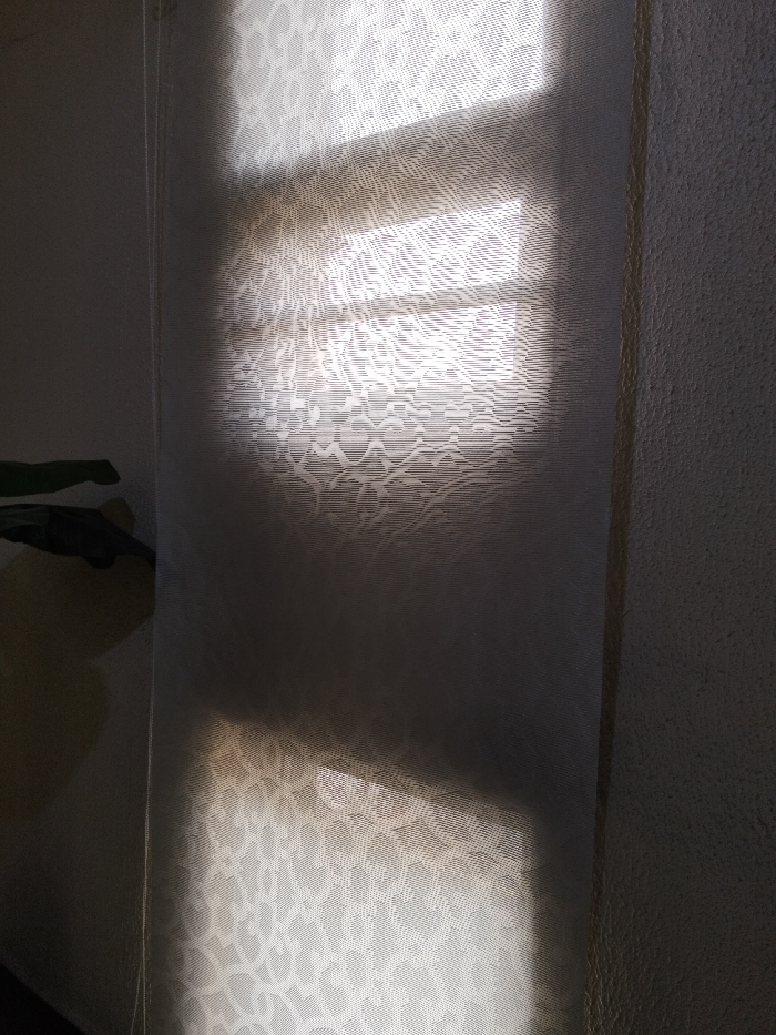The image displays an interior scene in Port-Harcourt, Nigeria. A light-colored, vertically oriented window blind, patterned with a repetitive abstract or stylized animal print, occupies the majority of the frame. Direct sunlight, entering through an unseen window, illuminates sections of the blind, creating distinct rectangular and linear patterns of light and shadow that traverse its surface. The illuminated areas appear bright, while significant portions of the blind and the adjacent wall on the right are cast in shadow. The wall exhibits a rough, textured finish. In the lower-left corner, a dark green object, possibly a plant leaf, is partially visible against a heavily shadowed background. No individuals are present, and no discernible actions or interactions beyond the effect of light on objects are depicted.