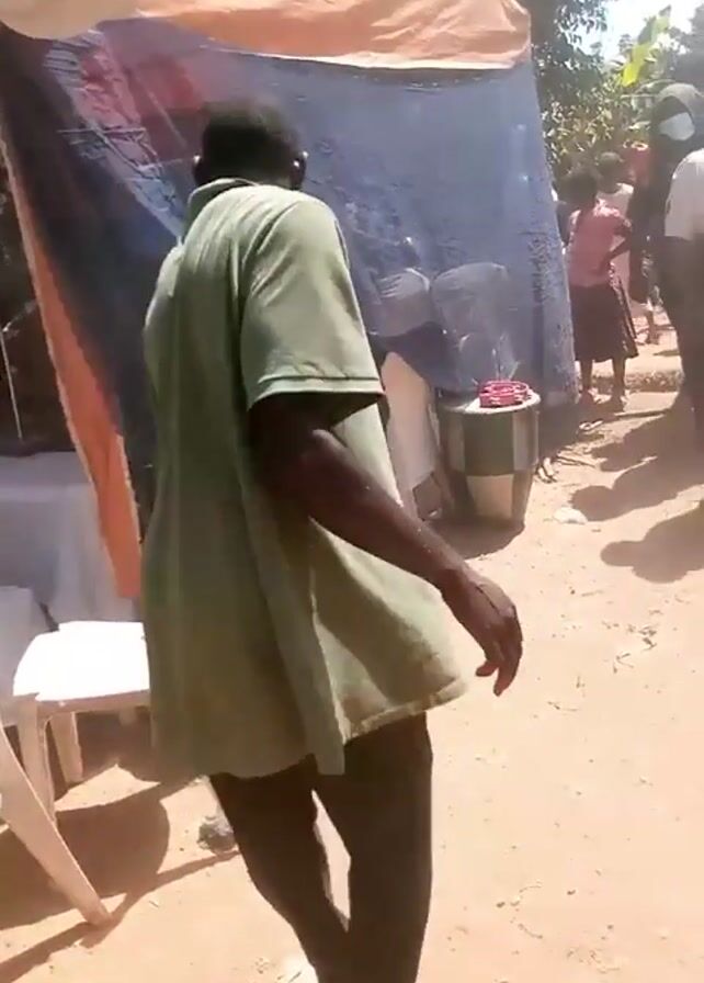 A medium shot shows a man in a short-sleeved tan shirt and dark pants standing in a dusty, outdoor space, possibly at an event or celebration. He turns towards the camera, opens his mouth wide, and appears to shout or sing with a smile on his face. Behind him, a person dressed in a traditional, colorful outfit dances. Other people are visible in the background, some with masks. White plastic chairs are stacked to the left, and a tent-like structure with "KAY RENTALS" printed on it is visible. Dust or smoke hangs in the air.