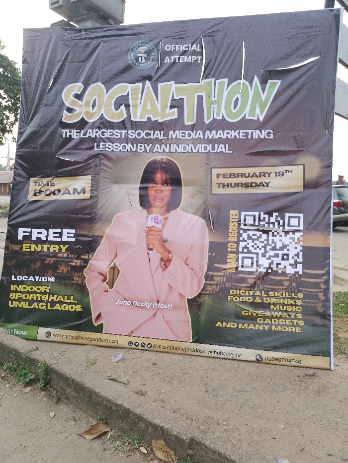 promotional banner for "Socialthon," an event advertised as "The Largest Social Media Marketing Lesson By An Individual." It is an official attempt to achieve Guinness World Records. The event, scheduled for February 19th, a Thursday, starts at 8:00 AM and features Jona Becky as the host. Entry is free and will be held at the Indoor Sports Hall, UNILAG, Lagos. Activities include digital skills, food and drinks, music, giveaways, gadgets, and more. A QR code is provided for registration. Contact information includes a website, social media handles, and phone number.