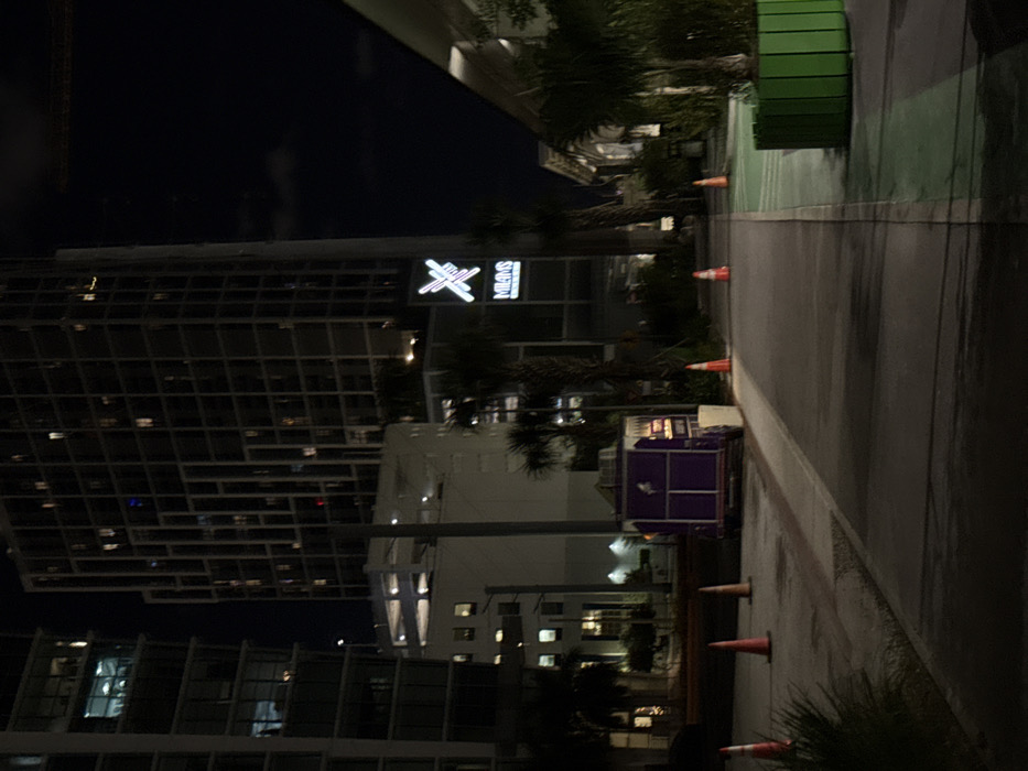A nighttime urban view presents the "X Miami" building with its illuminated logo at the top. Several traffic cones line a wet, dark sidewalk beside palm trees. A green dumpster sits further along the path. Nearby, a purple equipment box appears against the backdrop of other buildings. The scene is illuminated by artificial lighting, and a tall building with a distinct pattern of lighted windows dominates the left side of the image.