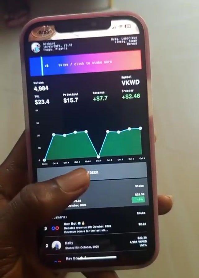 A hand holds an iPhone displaying a financial graph. The screen shows data like volume, revenue, and staking details. The person touches the screen, interacting with the application. The background is a casual indoor setting with furniture and possibly a person's feet visible. The iPhone has a pinkish case and the app interface is dark with green and blue elements.