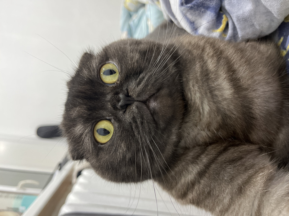 - "A gray tabby Scottish Fold cat with striking yellow-green eyes stares directly at the viewer, upside down" by FM-gQbQG2, licensed under CC BY 4.0