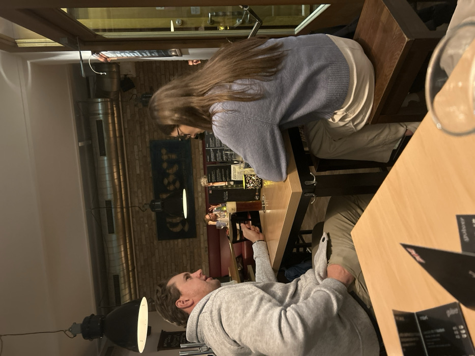 The image depicts the interior of Gösser Bierinsel, located at Landstraßer Hauptstraße 2A, 1030 Vienna, Austria. In the foreground, a light-skinned male with short brown hair, wearing a grey hooded sweatshirt and khaki pants, sits on the left. He holds a tall glass of dark beer in his left hand and faces a light-skinned female on the right. The female has long brown hair, wears glasses, a light blue knitted sweater, and light-colored pants; her back is partially oriented towards the observer. Both individuals are engaged in conversation, with the male appearing to speak. A light wooden table separates the two primary subjects, holding the beer glass, a patterned cup, and two black menu holders. The background features a brick wall, prominently displaying a blue painted sign with "GÖSSER" in yellow/white text. Two black industrial-style pendant lamps hang from the ceiling, which also shows exposed metal ventilation ducts. Red upholstered booth seating is visible in the middle ground, where two additional individuals are partially seated. A wooden doorframe with glass is present on the far right. The scene is illuminated by dim, warm lighting. A section of a third wooden table with a black menu is visible in the immediate foreground.