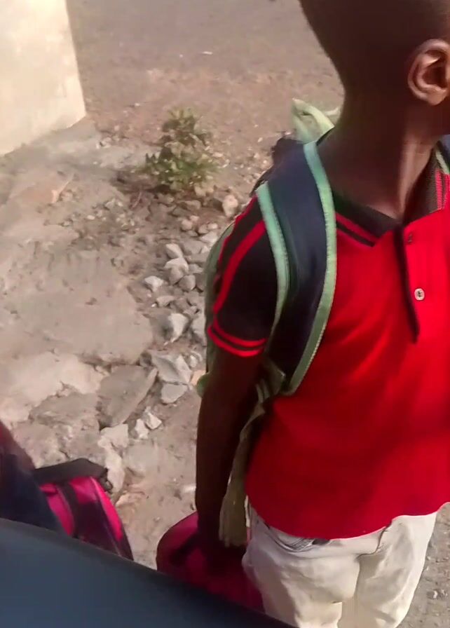 A young, dark-skinned child is standing next to a parked motorbike. The child is wearing a red polo shirt, light-colored pants, and a backpack. He has a very short haircut. The child is looking off to the side, seemingly observing something. The child is holding the motorcycle handlebar, which has a colorful grip. The background shows a dusty, uneven ground surface and some buildings or structures. The overall lighting appears to be slightly bright, possibly outdoor daylight.