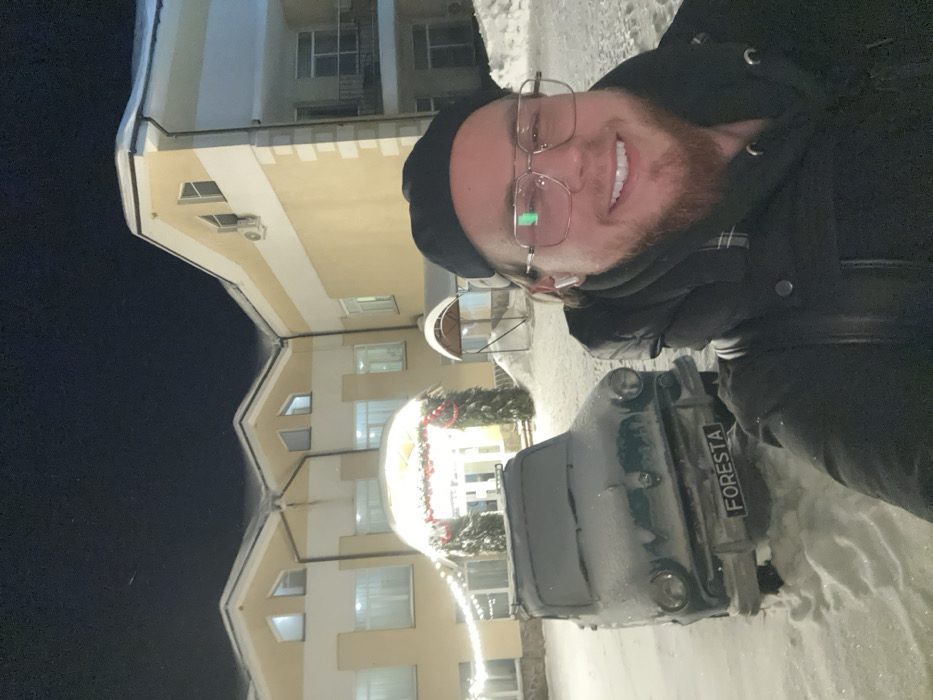A person wearing glasses, a black jacket, and a black cap smiles into the camera. Behind the individual is a snow-covered vintage vehicle with "FORESTA" on its license plate. Further in the background is a multi-story building with illuminated windows and an arched entrance adorned with Christmas decorations. Snow covers the ground, and the sky is dark, suggesting an evening setting.