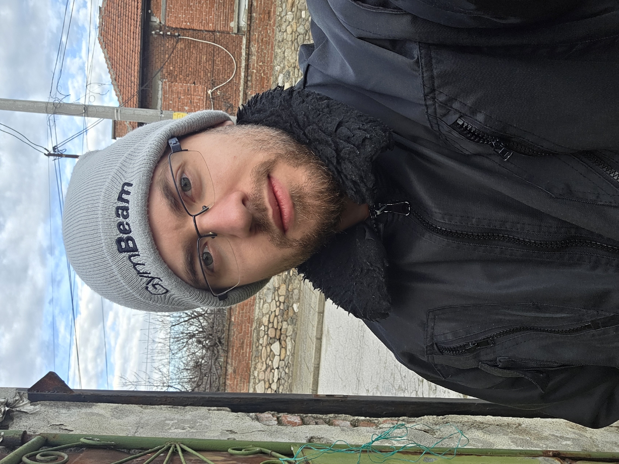 A man with a beard and glasses, wearing a grey beanie with "GymBeam" written on it and a black jacket with a fur-lined collar, is pictured in what appears to be an outdoor setting in Yagodovo, Bulgaria