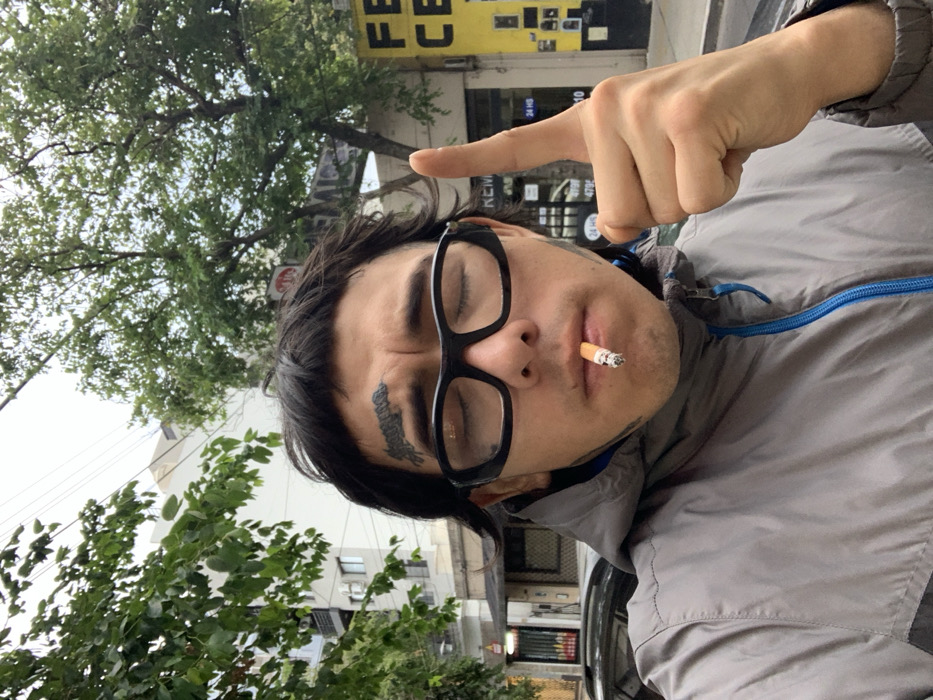 A head-and-shoulders portrait captured on an overcast day depicts an individual, presumably male, with dark hair and a tattoo resembling text above his right eyebrow