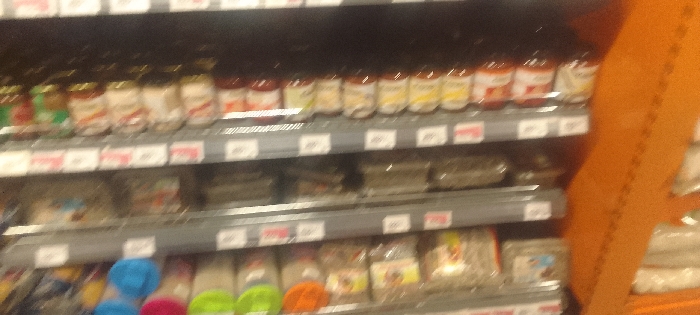 The scene depicts the interior of a retail establishment, likely a supermarket or grocery store aisle, characterized by significant motion blur across the entire frame. Multiple levels of commercial shelving units are visible. The uppermost shelf displays a uniform row of numerous glass jars, containing various products identifiable by different colored labels and contents (red, yellow, white, and green hues are discernible). Below this, subsequent shelves hold an array of packaged goods, many appearing in clear plastic containers or wraps, with their specific contents rendered indistinct by the blur. Small, rectangular white price tags or informational labels, featuring red elements, are consistently affixed to the front edge of each shelf. On the far right side of the image, a vertical, orange-colored structural element, possibly an end-cap or support beam of the shelving unit, is partially visible, exhibiting a textured or perforated surface. No individuals are present in the image. The specific location within Viwandani ward, Kenya, is not visually identifiable from the provided details.