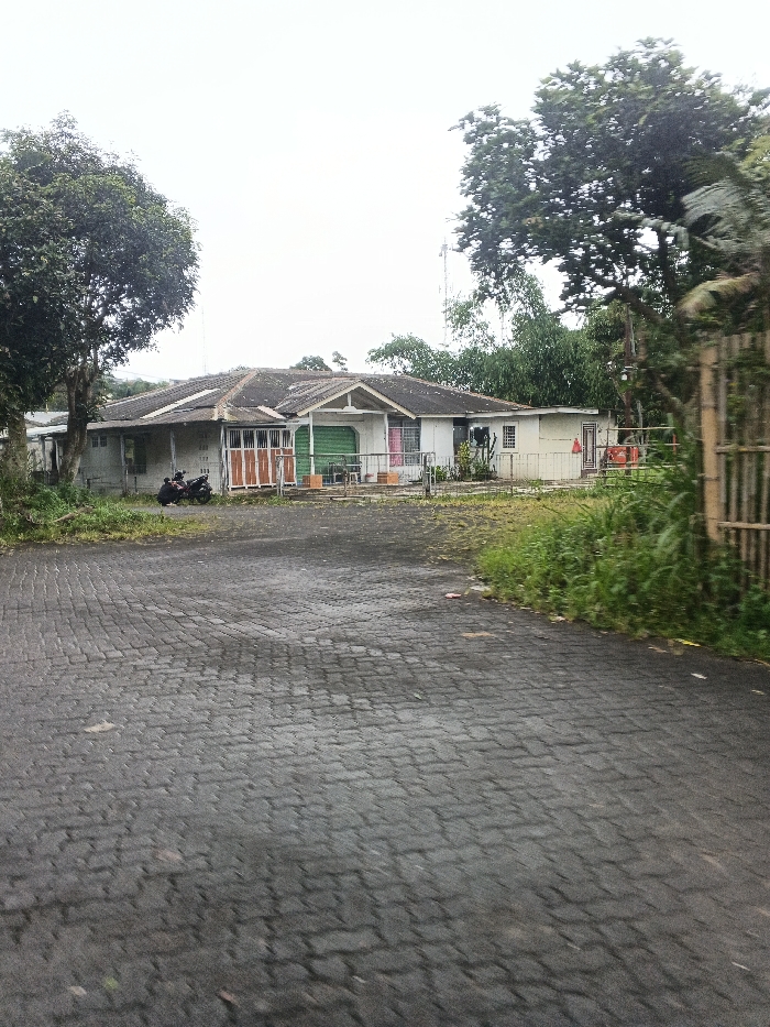 The image captures an outdoor scene in Masaiti, Zambia, under an overcast sky, presenting a single-story building situated behind a paved forecourt. The building, primarily white or light-colored, features a multi-gabled, dark-colored roof displaying signs of weathering. A central section of the facade includes a recessed porch area with a closed green roller shutter, indicative of a commercial storefront, flanked by windows, some equipped with security bars and visible curtains. A light-colored metal railing is present along the front of this porch section. To the left side of the building, two individuals are visible, one bending over a parked dark-colored motorcycle, while the other stands nearby, suggesting an interaction with the vehicle. The foreground is a dark grey paver block surface, arranged in a herringbone pattern, exhibiting dampness and general wear. Dense green vegetation, comprising large trees with full canopies, shrubs, and tall grass, borders the paved area and envelops the building. A wooden slatted fence is partially visible on the far right, with a tall, slender communication tower or antenna discernible above the distant tree line.