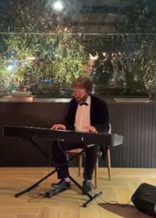 A man is playing an electric piano in what appears to be a restaurant or event space
