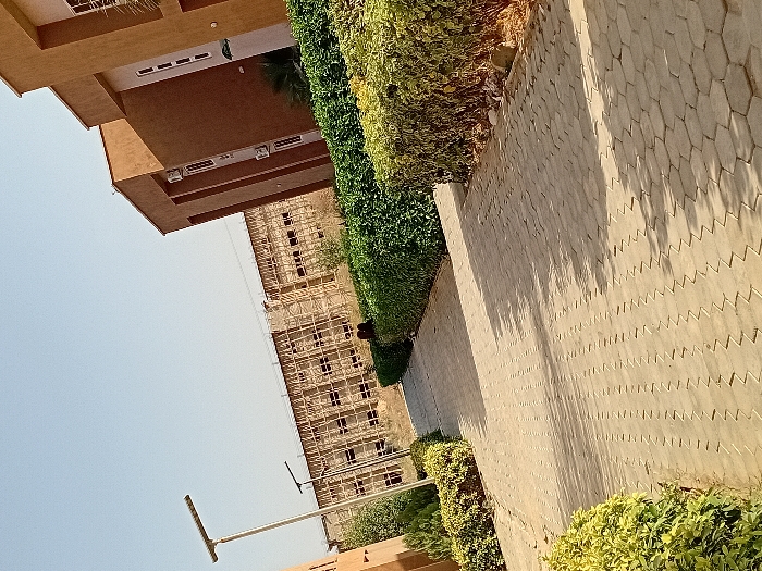 An outdoor scene featuring two buildings and a paved walkway. One building is complete and colored tan, while the other appears under construction with visible scaffolding. A dense green hedge separates the building from the paved path, which features a repeating zigzag pattern. Low-lying bushes add greenery along the walkway's edge. A clear sky forms the backdrop, with a lamppost visible in the foreground.
