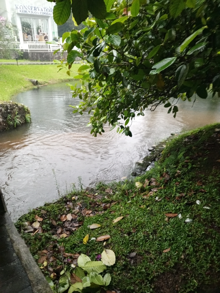 A murky river flows through a green landscape. Lush foliage hangs over the water's edge, while mossy grass and fallen leaves cover the bank. Across the river, a building with the words "KONSERVATORI KEBUN RAYA CIBODAS" is visible. The scene is overcast, with the water reflecting the grey sky. A pipe empties into the river. The overall impression is one of serene natural beauty.