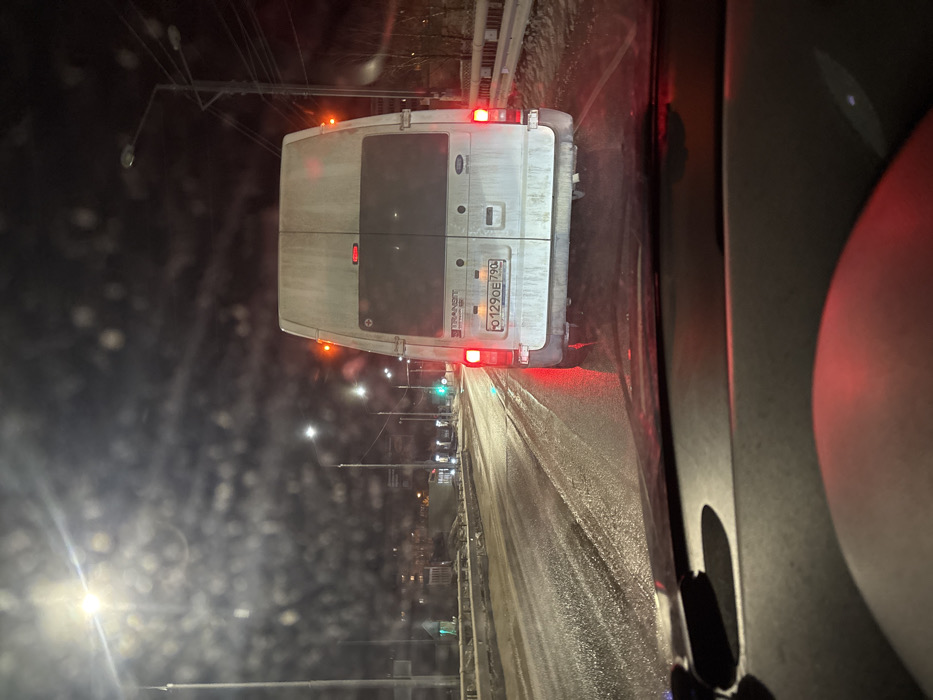 A forensic description of the scene follows: The image captures a nighttime vehicular perspective through a rain-streaked windshield. In the foreground, the dark dashboard and a red-illuminated portion of a steering wheel from the observer's vehicle are visible. The main subject, centered in the midground, is the rear of a dirty, white Ford Transit van. The van displays a Russian license plate "O129OE 790", indicating the Moscow Region, Russia. Both red tail lights are illuminated, suggesting the vehicle is braking or stationary. A small red square decal with a white cross symbol is affixed to the upper left rear door of the van. The vehicle is on a wet, asphalt road, likely a multi-lane thoroughfare, with reflections of light on the surface. Metal guardrails line both sides of the road. To the left, a green traffic light is visible further down the road, along with multiple streetlights and distant structures. The right side of the road features scattered patches of snow on the ground adjacent to the guardrail and sparse trees/bushes. The sky is dark and overcast. There are no individuals explicitly visible in the frame.