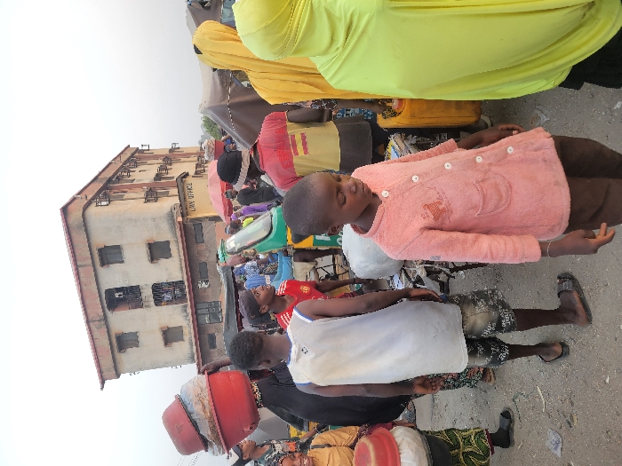 An outdoor scene shows a crowded area with people walking. Some carry items on their heads, including red containers. A child in a pink sweater and brown pants appears prominently, positioned horizontally in the frame. Several other people are visible, including someone in a yellow garment. A tall building with multiple windows is present in the background. The lighting suggests it is daytime.