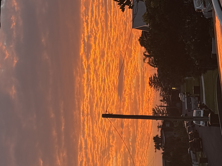 A captivating sunset fills the sky with a vivid orange hue, displaying a unique cloud formation that resembles rippling waves. Below, a residential street features parked vehicles and trees, their silhouettes contrasting against the bright sky. A utility pole stands tall, its wires adding a touch of urban life to the scene. A house peeks from behind the trees.