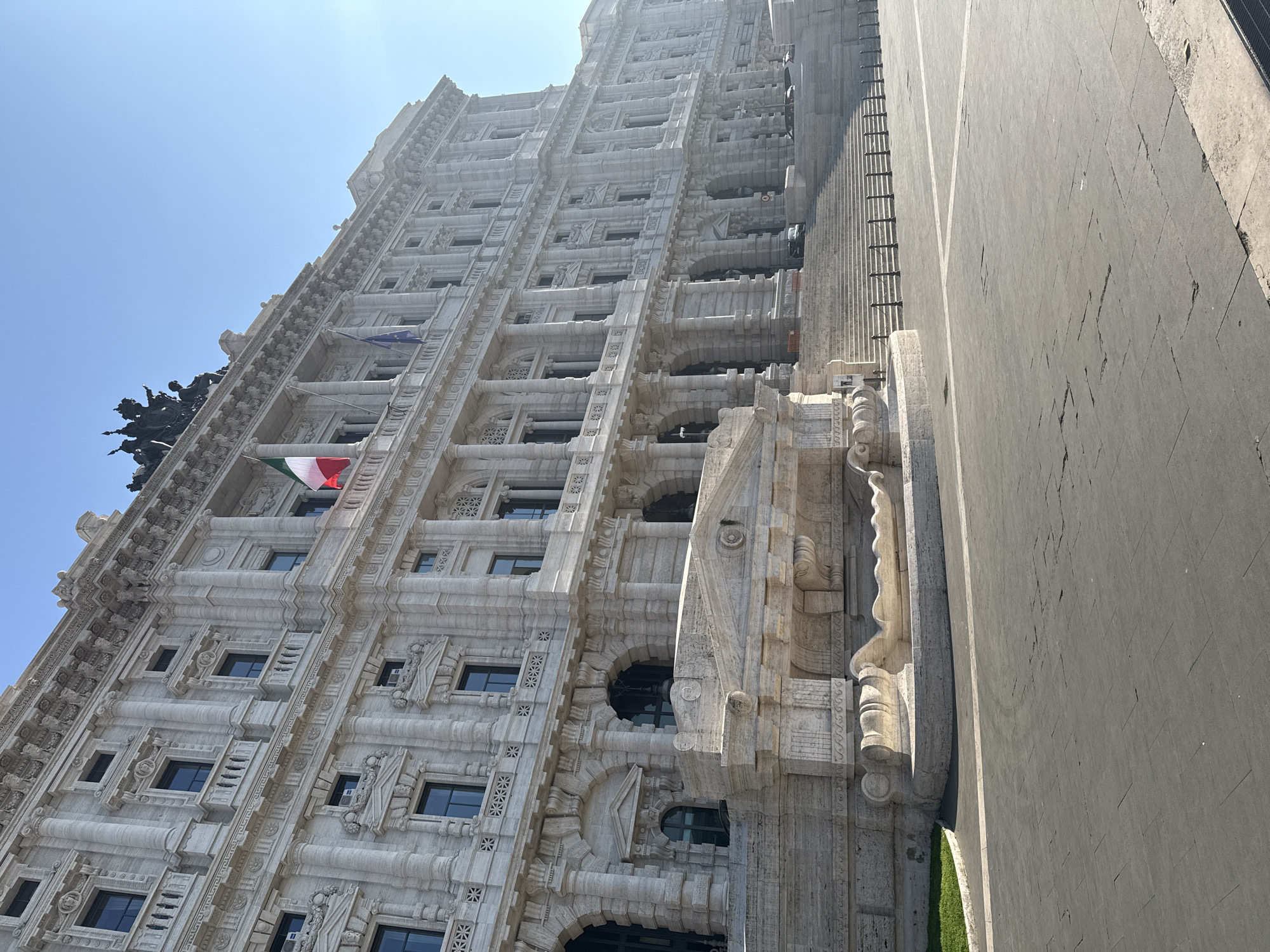 The image displays the monumental Palazzo di Giustizia (Palace of Justice) in Rome, Italy, situated prominently on the Piazza dei Tribunali, near the Tiber River. The building is a massive, multi-story structure constructed from light-colored stone, likely travertine, exhibiting a highly ornate Neo-Baroque or Umbertine architectural style. Its facade is characterized by numerous columns, pilasters, recessed rectangular windows with dark frames, ornate balustrades, and intricate carvings. An Italian national flag (vertical green, white, red stripes) and a European Union flag (blue with yellow stars) are visibly mounted on a balcony on one of the upper levels. Large, dark sculptural groups, including a quadriga, adorn the building's roofline, silhouetted against a clear, bright blue sky. In the immediate left foreground, a large, elaborate stone fountain is positioned, featuring multi-tiered designs and a wave-like basin. The ground in front of the building consists of a wide, paved plaza of dark grey stone pavers, showing minor surface irregularities and cracks, illuminated by direct sunlight. A narrow strip of green grass is visible along the far left edge of the paved area, adjacent to the fountain. A grand, wide staircase leads directly from the plaza up to the main entrance of the Palace of Justice. A dark metal chain barrier with vertical posts lines the base of this staircase. No individuals or active vehicles are present in the immediate scene, and the environment is brightly lit under a clear, sunny sky, creating a slight haze in the upper right.