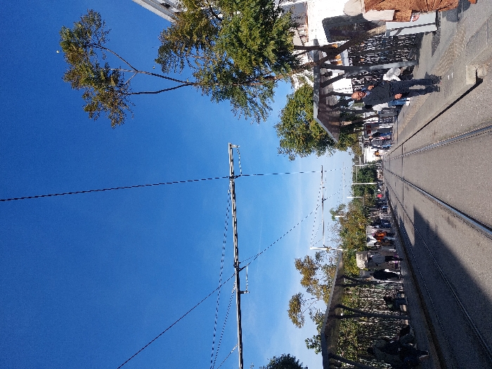 A sunny outdoor scene features trolley tracks running horizontally. Along the track's right side, pedestrians walk along a sidewalk lined with trees and covered benches. A man stands near a bench, appearing to observe the scene. Overhead trolley lines cross the clear blue sky. A tree with sparse foliage frames the upper left corner of the view.