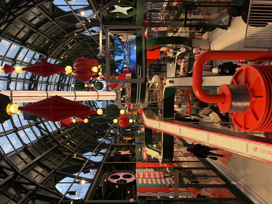 This image depicts the interior of the GUM (State Department Store) on Red Square in Moscow, Russia. The scene is a multi-level commercial space featuring a high, arched glass roof supported by dark metal trusses. The environment is elaborately decorated with a whimsical, holiday-themed design, primarily utilizing red, green, and white colors with gold accents. A prominent, long, upward-sloping conveyor belt structure with white treads and red railings bisects the central view, carrying small, stylized gift boxes. A shorter, downward-sloping conveyor belt is visible on the right, also transporting small objects. Numerous large, geometrically shaped lanterns and ornaments, primarily red diamond-like shapes and green multifaceted spheres, hang suspended from the ceiling, interspersed with spherical lights. On the lower levels, several shopfronts and display areas are visible, featuring various merchandise and integrated into the festive decor. Large, red, cylindrical structures resembling industrial machinery, along with red bent pipes, are located on the ground floor, enhancing a factory or toy workshop aesthetic. A large horizontal display screen on an upper level shows animated content featuring similar whimsical elements. Approximately 10-15 individuals are present across the different levels, casually dressed. They are seen walking, browsing shop displays, standing, and observing the environment. One individual in the mid-ground walks left carrying a bag. The lighting is a mix of natural light from the glass roof and artificial illumination from hanging fixtures and internal shop lights. Signs with Cyrillic script are visible on the left wall, including the GUM logo.