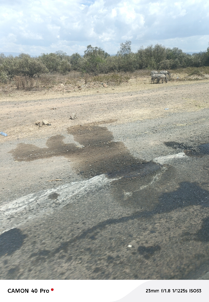 The image displays an outdoor scene in Mbaruk/Eburu ward, Kenya. In the foreground, a dark gray paved road surface exhibits irregular dark liquid patches and lighter gray streaks. Shadows are cast on the lower right section of this surface. Beyond the paved road, a lighter brown, unpaved dirt shoulder or track contains scattered small rocks and sparse dry vegetation. A light blue plastic item rests on the dirt near the left frame edge. In the midground, three zebras are present on the unpaved ground, appearing to graze. The background features a dense line of trees and shrubs with light green to brownish foliage under a partly cloudy sky with white cumulus clouds. Distant topographical features are faintly visible on the horizon. No human subjects are discernible.